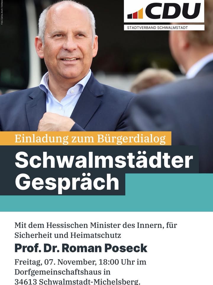 Die CDU Schwalmstadt lädt alle Bürgerinnen und Bürger herzlich zum diesjährigen Schwalmstädter Gespräch am Freitag, 07. November 2025, um 18:00 Uhr im Dorfgemeinschaftshaus Michelsberg ein.
